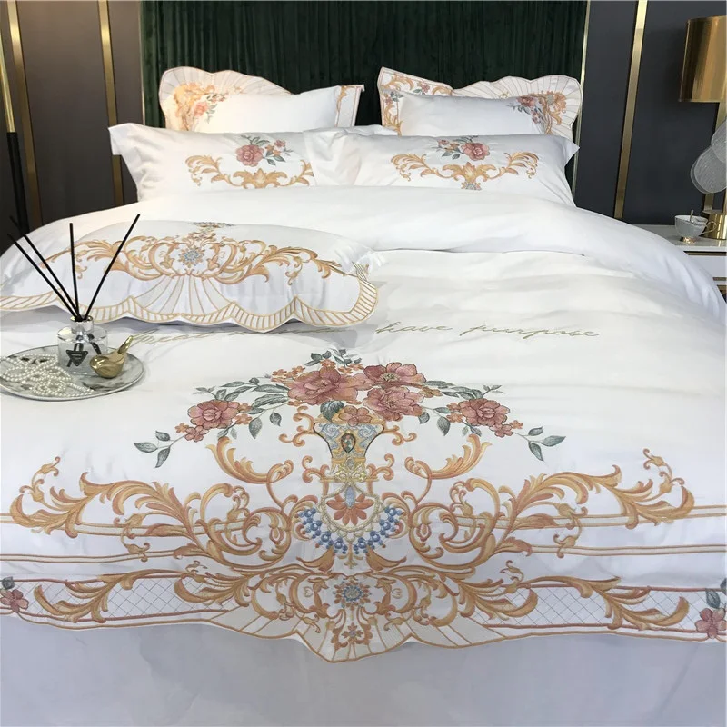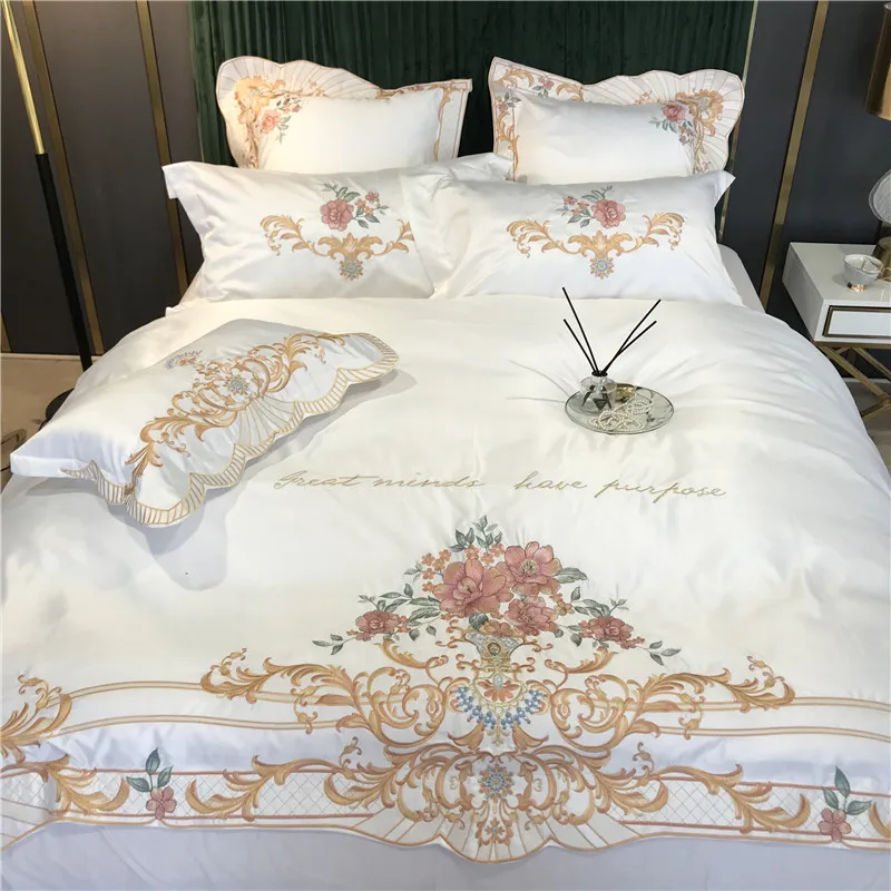 Product Name: New Luxury White American Flower Embroidery Palace Set Di Biancheria Da Letto In Cotone Di Seta Satinata Copripiumino Federe Per Lenzuola Piatte/con Angoli