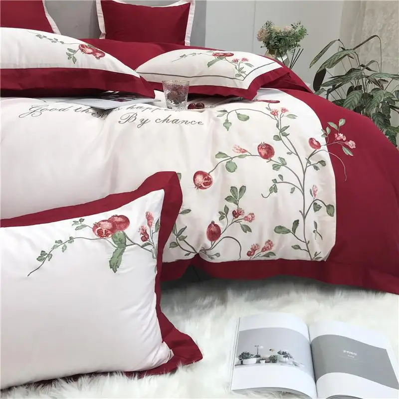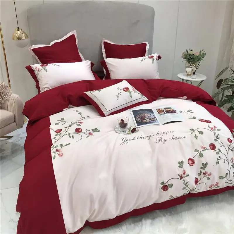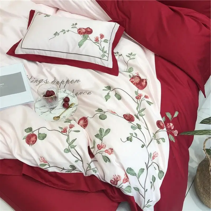Product Name: Nuovo Lusso Rosso Americano Pastorale Fiori Ricamo 80S Biancheria Da Letto In Cotone Egiziano Set Copripiumino Lenzuola Lenzuola Federe