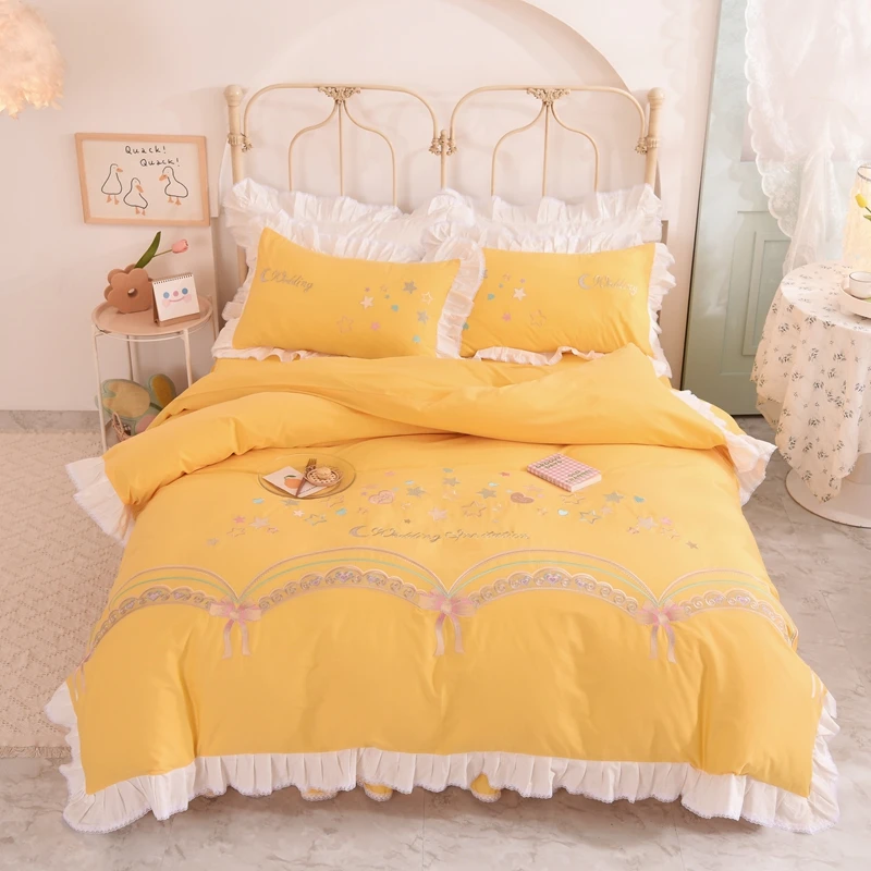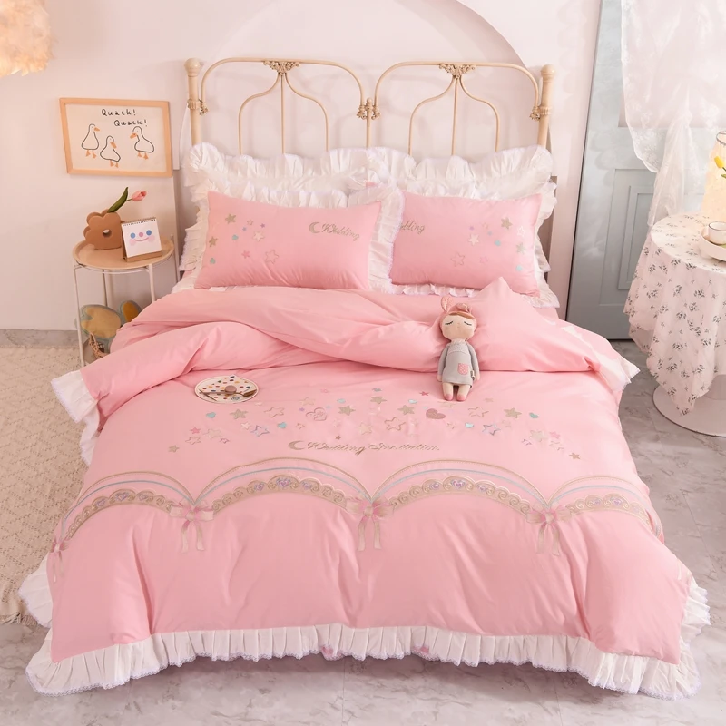Special Offer New Luxury White 100% Cotton Stars Love Embroidery Princess Girls Set Di Biancheria Da Letto Copripiumino Con Volant Lenzuolo Gonna Federe Discount (43%OFF) Today!