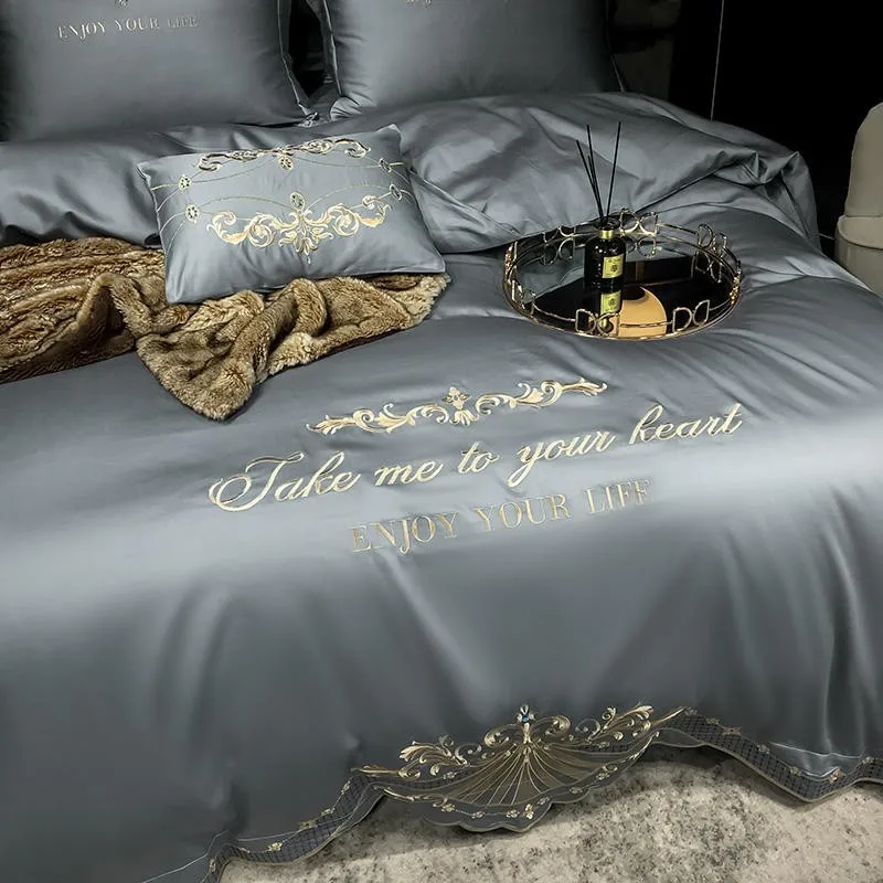 Product Name: Set Biancheria Da Letto Grigio Ricamato Di Lusso Queen King 4 Pezzi Copripiumino Morbido In Cotone Egiziano Set Lenzuola Set Copripiumino Con Cerniera